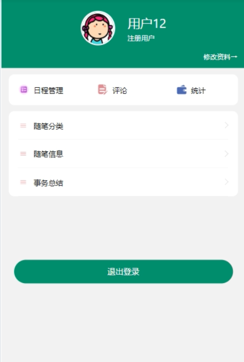 - 我的:包含了修改资料、日程管理、评论、统计、随笔分类、随笔信息、事务总结、退出登录等功能入口。