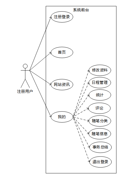 在个人事务处理小程序中注册用户注册用户包括首页浏览、网站资讯查看、修改个人资料、日程管理、评论发布、统计查看、随笔分类与信息管理、事务总结以及退出登录。首页为用户提供操作入口;网站资讯让用户获取信息;修改资料用于完善个人信息;日程管理是核心功能,用户可添加、查看、修改和删除日程,并接收提醒;评论功能促进用户交流;统计帮助用户了解自身事务处理情况;随笔分类与信息管理满足用户记录和整理需求;事务总结方便用户回顾反思;退出登录保障账号安全。这些用例相互关联,共同服务于用户高效管理个人事务的目标。注册用户用例图如下所示: