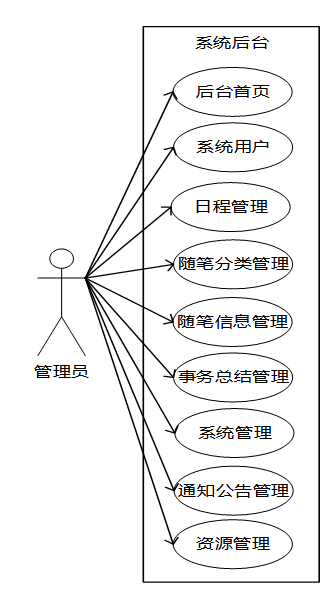 个人事务处理小程序中管理员则集成了后台首页操作、日程管理、系统用户管理、随笔分类与信息管理、事务总结管理、系统管理、通知公告管理以及资源管理。后台首页是操作核心;日程管理可查看所有用户日程;系统用户管理涵盖对用户信息的各类操作;随笔分类与信息管理确保内容质量;事务总结管理为系统优化提供支持;系统管理保障系统稳定;通知公告管理及时传达信息;资源管理合理分配资源。各用例紧密协作,使管理员能够有效维护和管理系统,为注册用户提供稳定、优质的服务。管理员用例图如下所示:
