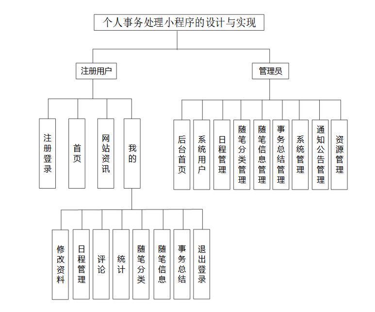 整个个人事务处理小程序是由多个功能模块组合而成的,根据用户需求分析,本系统主要可以划分为注册用户和管理员两大模块。各模块又可细分为不同的子功能设计,实现多角色协作,负责不同的职能,每个角色对应的功能模块如图所示。