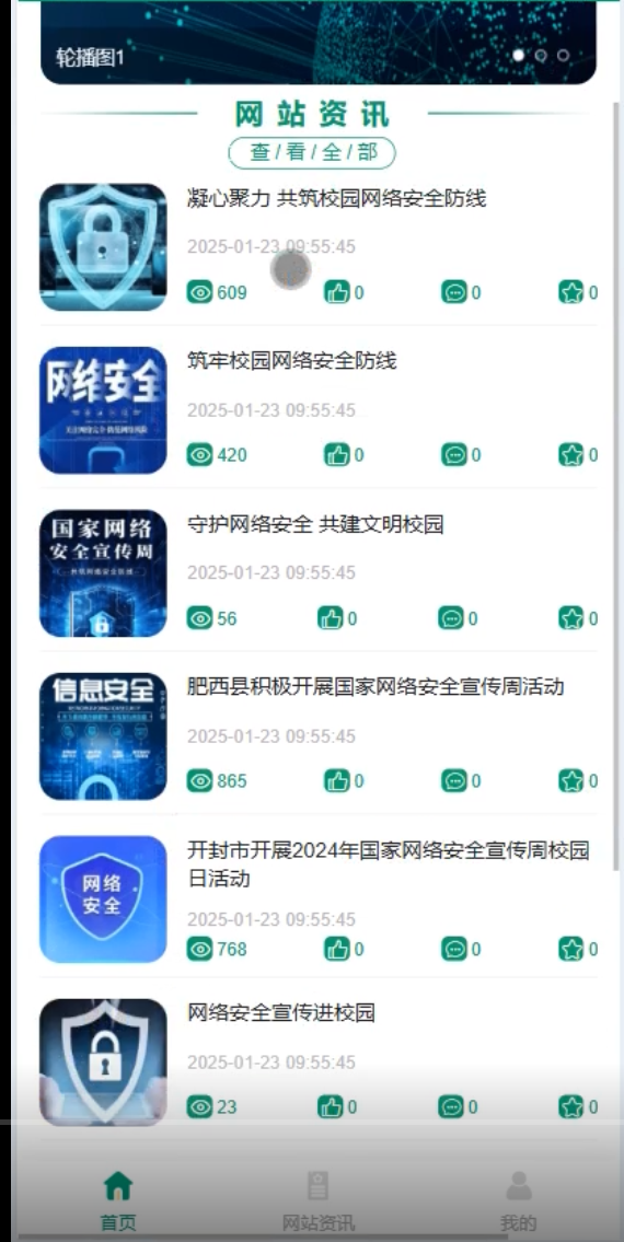 - 首页:用户登录系统后首先进入首页界面,该界面主要提供系统功能导航和系统重要信息和推荐信息概览,包括可查看轮播图、网站公告等内容;并提供网站资讯、我的等系统子功能链接入口。