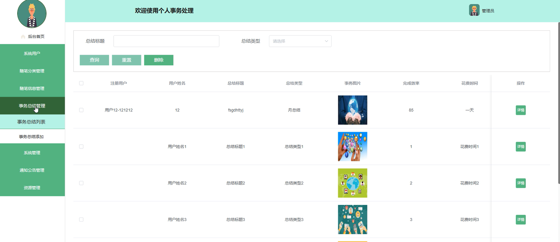 - 事务总结管理:对用户的事务总结进行管理和分析,为系统优化提供数据支持。