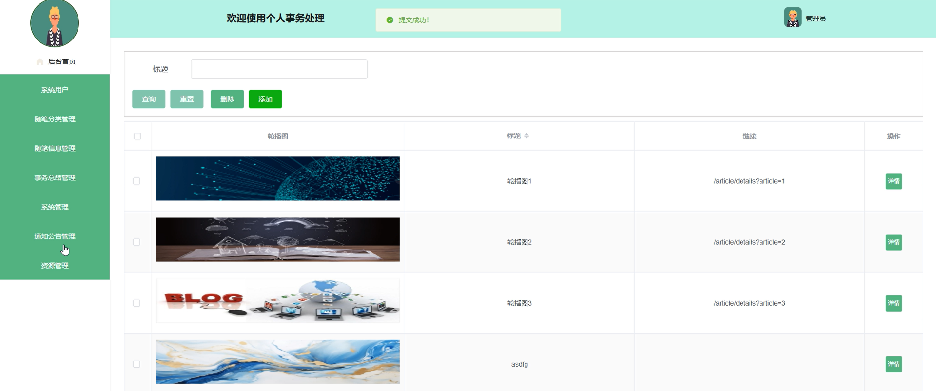 - 系统管理:管理员可对首页的轮播图进行管理,实现增删改查操作,提供标题搜索功能,支持添加图片附带链接信息。