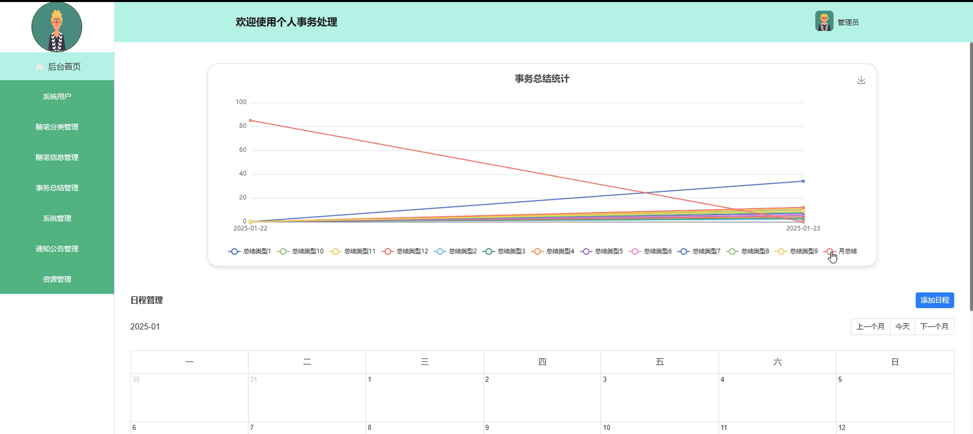 - 日程管理:与用户端日程管理功能类似,但管理员可进行更全面的管理,如查看所有用户日程等。