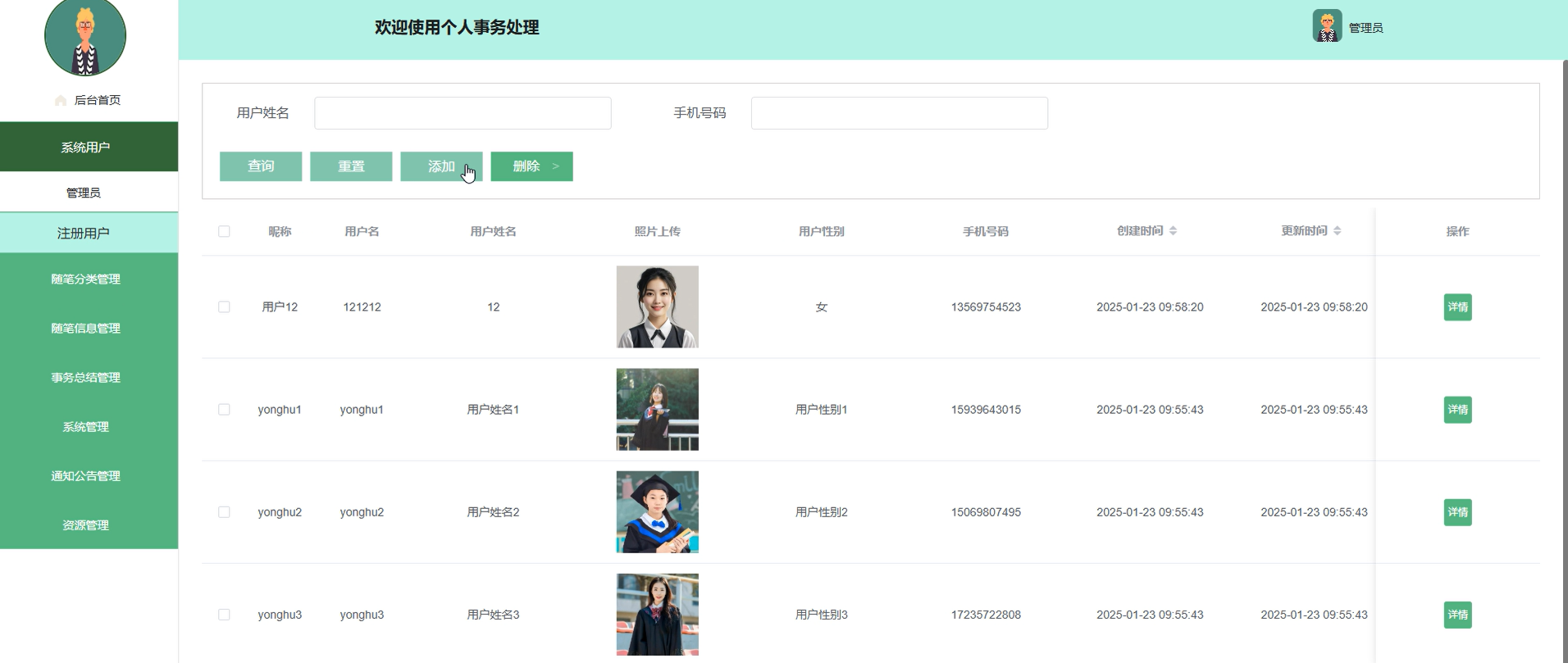 - 系统用户:管理员可对系统用户信息进行管理,包括注册用户和管理员等用户,实现添加、删除、封禁和审核用户信息等操作。
