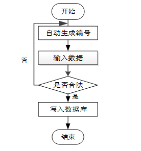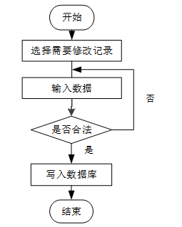 用户首先选择需要修改的记录,输入修改后的数据,系统判断输入数据是否合法。若数据不合法,提示重新输入,若数据合法,则将修改后的数据写入数据库,完成操作后流程结束。修改信息流程图如下图所示。