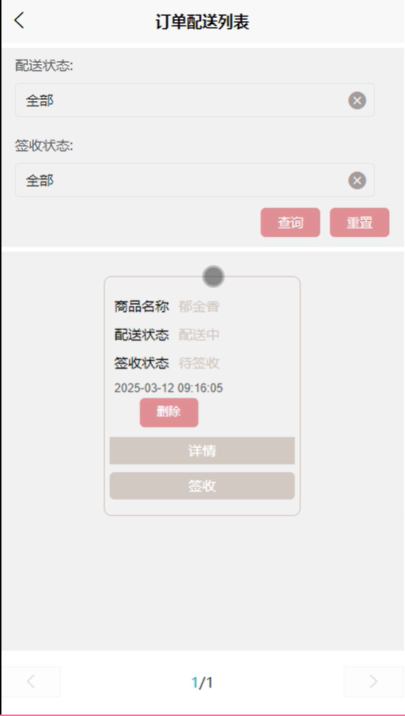 订单配送:用户可以查看订单配送详情并进行签收操作,同时支持查询、重置和删除等功能,确保订单处理的高效和准确。