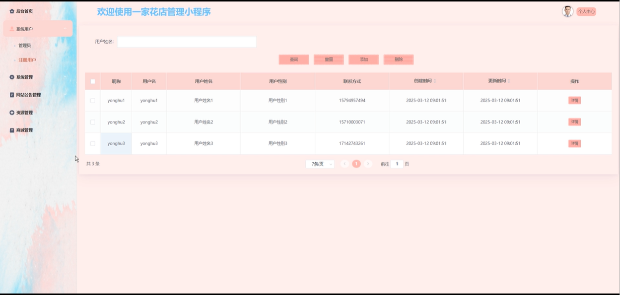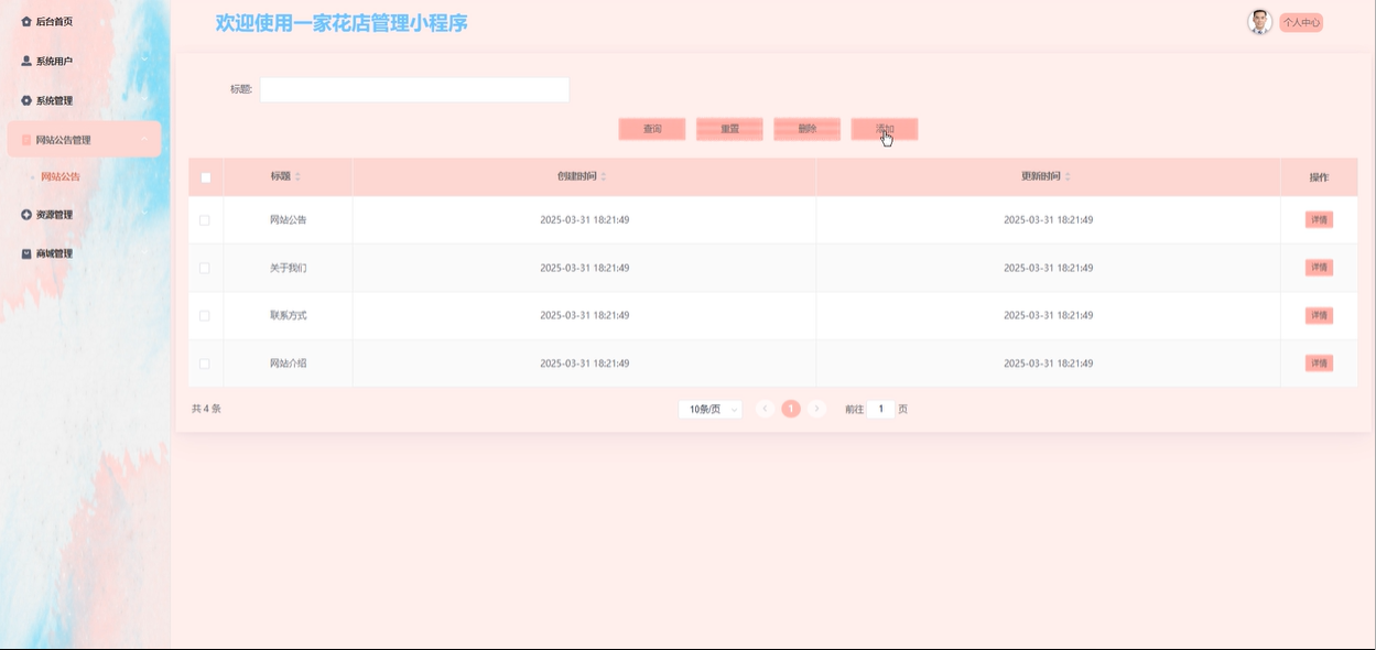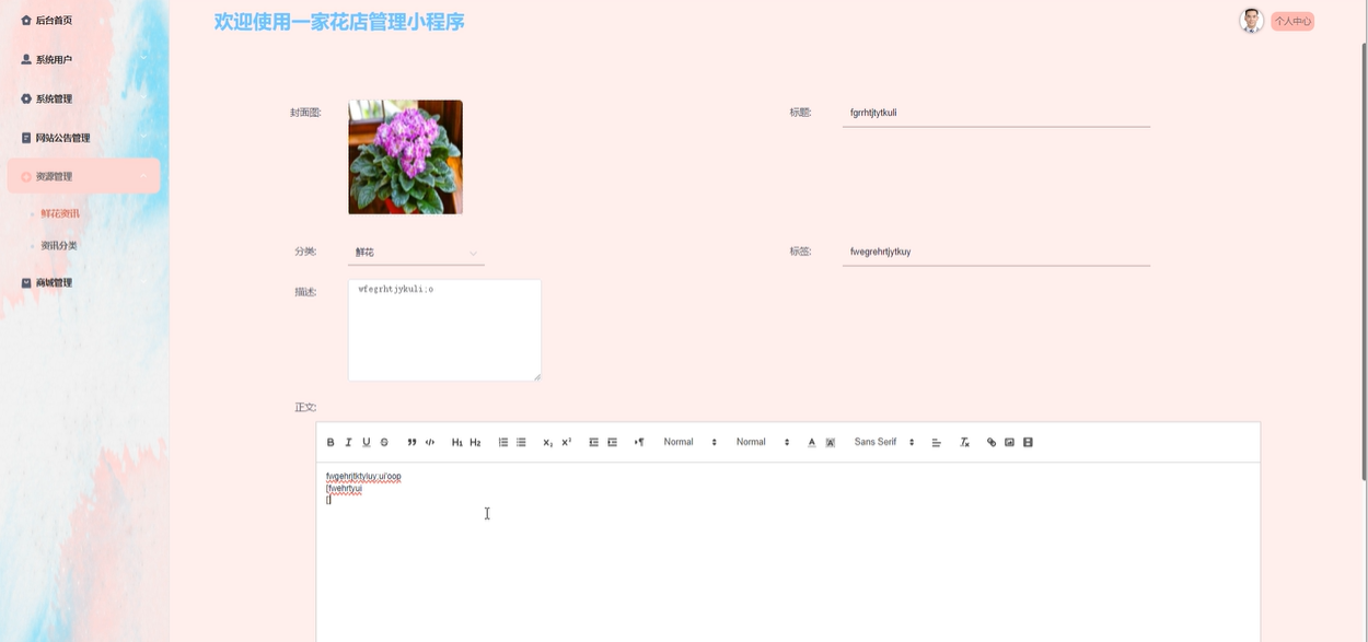 资源管理:管理员可以管理鲜花资讯及其分类,执行查看详情、用户评论、增删改查等操作,为用户提供丰富且有序的信息资源。