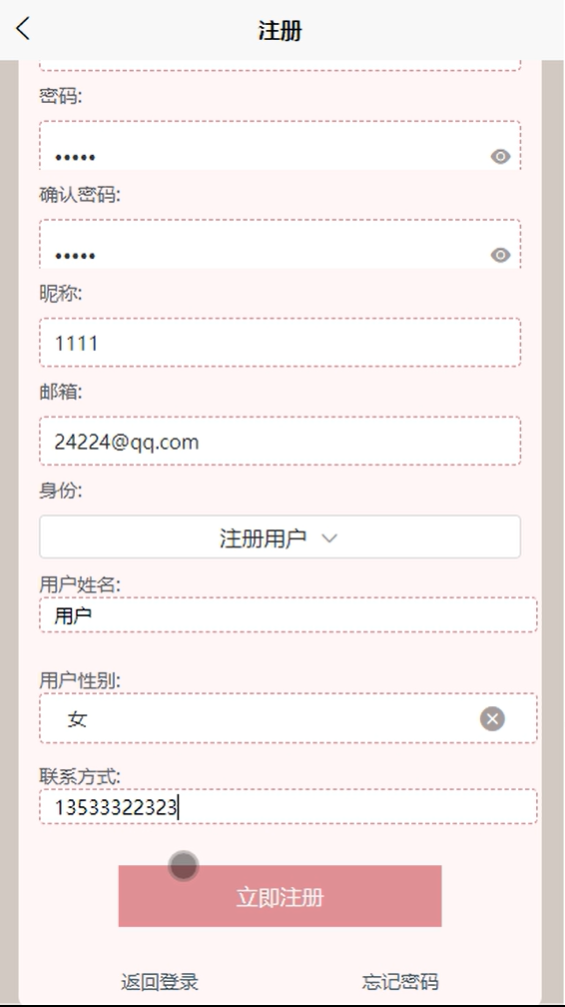 注册页UserController.java,传入user对象,并将"user_id"、 "state"、 "user_group"、"login_time"、"phone"、"phone_state"、 "username"、"nickname"、"password"、"email"、"email_state"、"avatar"、"create_time"输入,重点是 "username"、"nickname"、"password"必须输入,通过获取username,数据库查询是否有该用户,如果存在,则提示“用户已存在”,否则执行将UserId置为空(数据库表中该字段已设置自动递增),代码如下: