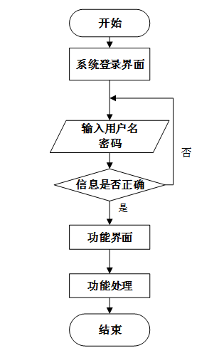 用户首先进入系统登录界面,输入用户名和密码后,系统验证信息是否正确。若验证失败,返回登录界面重新输入,若验证成功,则进入功能界面,执行相应功能处理后结束操作流程。操作流程如下图所示。