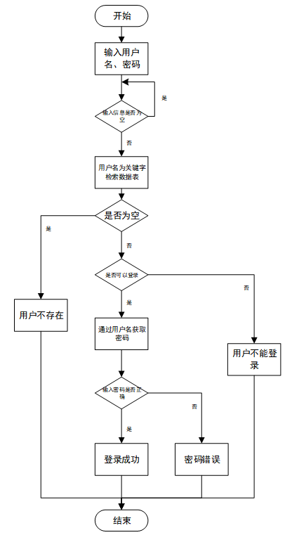 用户输入用户名和密码后,系统先检查输入是否为空,再验证用户名是否存在,若存在则通过用户名获取密码并校验。若密码正确则登录成功,否则提示密码错误。若用户名不存在或无法登录,提示用户操作无效。如下图所示。