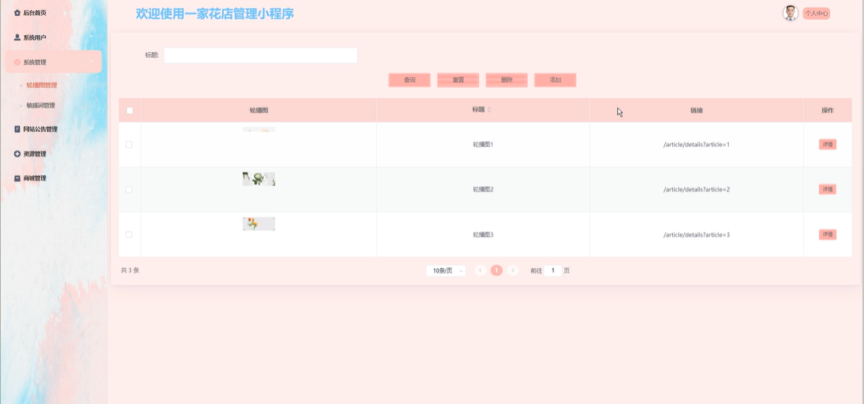 系统管理:管理员可以管理轮播图和敏感词,执行查看详情、增删改查等操作,确保展示内容的多样性和安全性。