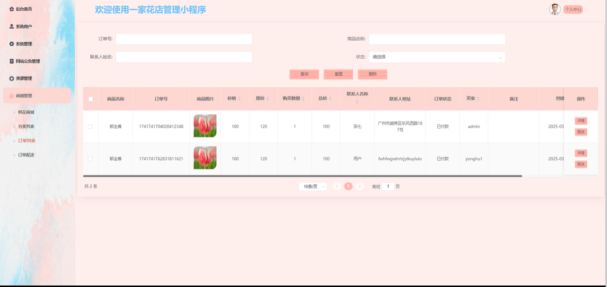 商城管理:管理员可以管理鲜花商城,包括查看详情、用户评论、增删改查等操作,并管理分类列表,确保商品分类清晰明确。此外,管理员可以查看各用户的购买商品订单详情和配送情况,通过输入订单号、商品名称、联系人姓名及选择状态进行搜索、查询、重置、删除等操作。对于订单配送,管理员可以查看订单配送详情和签收状态,选择配送状态、签收状态进行搜索、查询、重置、删除等操作,并更改配送状态。