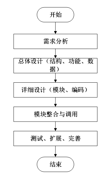 系统开发流程的主要步骤,从需求分析到系统完成的全过程。流程包括需求分析、总体设计(结构、功能、数据)、详细设计(模块、编码)、模块整合与调用,以及测试、扩展和完善,最终完成系统的开发。本系统的开发流程如下图所示