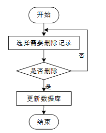 用户选择需要删除的记录后,系统判断是否确认删除。若未确认,返回选择环节,若确认删除,则更新数据库,删除对应记录,完成操作后流程结束。删除信息流程图如下图所示。
