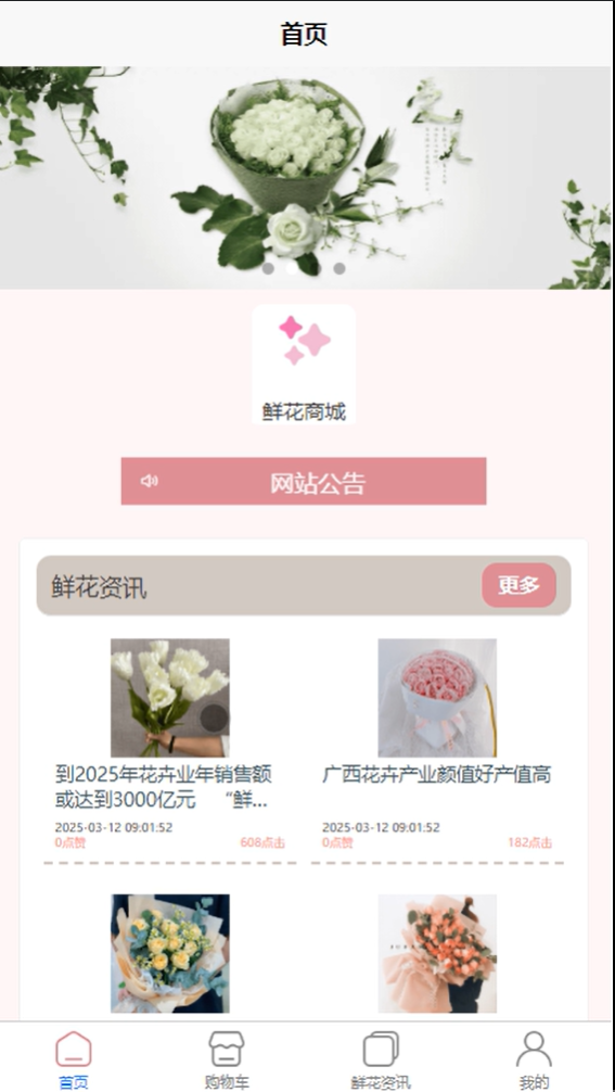 首页:首页展示了轮播图、网站公告、购物车入口以及鲜花资讯等内容,方便用户快速获取最新信息并进入感兴趣的板块。