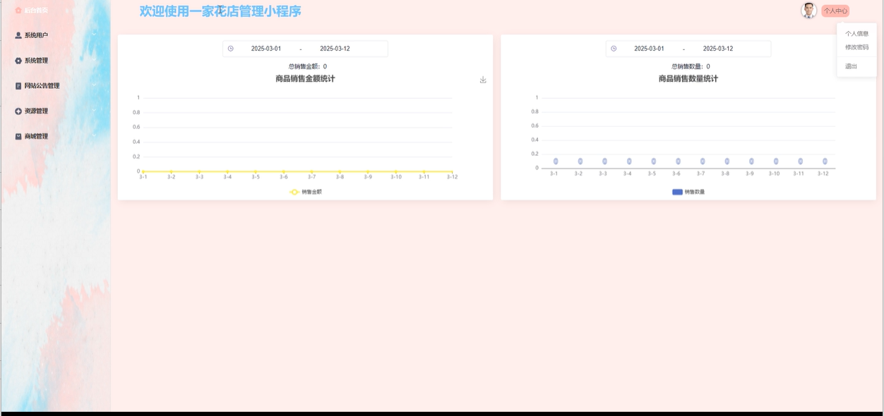 后台首页:管理员可以在后台首页查看商品销售金额统计、商品销售数量统计,并修改个人资料,便于日常管理和自我维护。