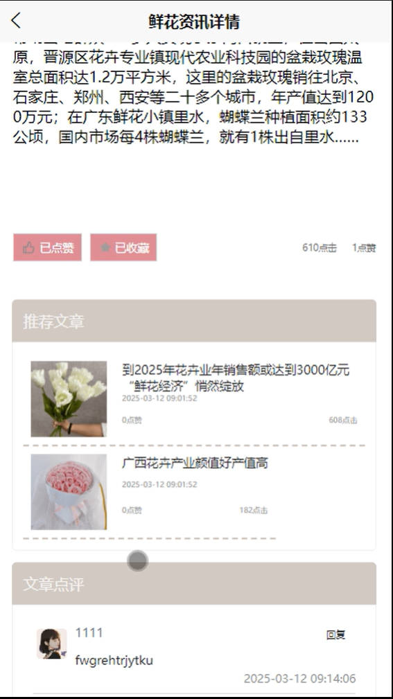 鲜花资讯:用户可以查看详细的鲜花资讯,并进行搜索、点赞、收藏、评论及回复操作,增加了用户互动性,便于分享养花知识。