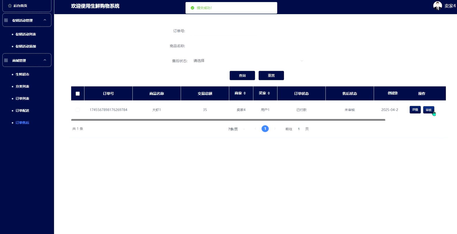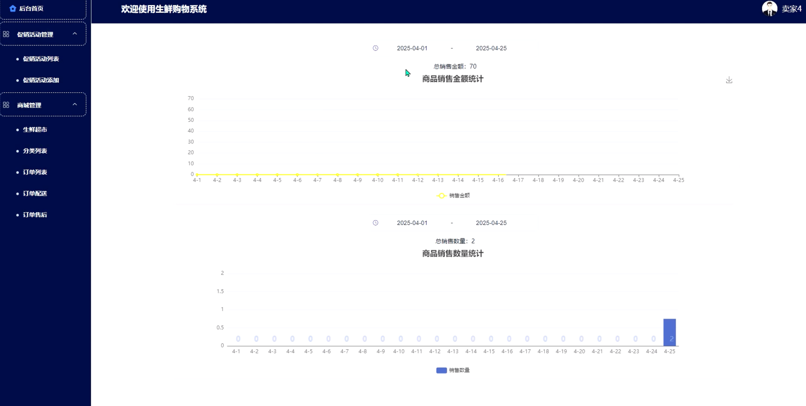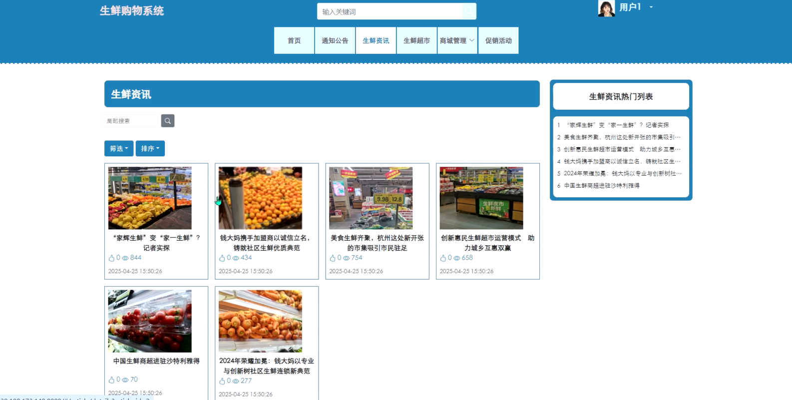 With the rapid development of Internet technology and e-commerce, the fresh food shopping industry has gradually transformed from offline entity mode to online platform. Traditional fresh food sales rely on physical storefronts, which have problems such as high operating costs, limited sales scope, and untimely information updates. The fresh shopping system adopts front-end Vue and back-end SpringBoot technology architecture, combined with MySQL database. The system provides users with functions such as fresh food information, promotional activities, notification announcements, fresh supermarkets, fresh food details, address management, shopping carts, order management, and after-sales applications; Sellers can view promotional activity lists, order lists, and handle after-sales orders; Administrators are responsible for managing regular users, seller users, promotional activities, notifications, fresh food information releases, and mall system management.