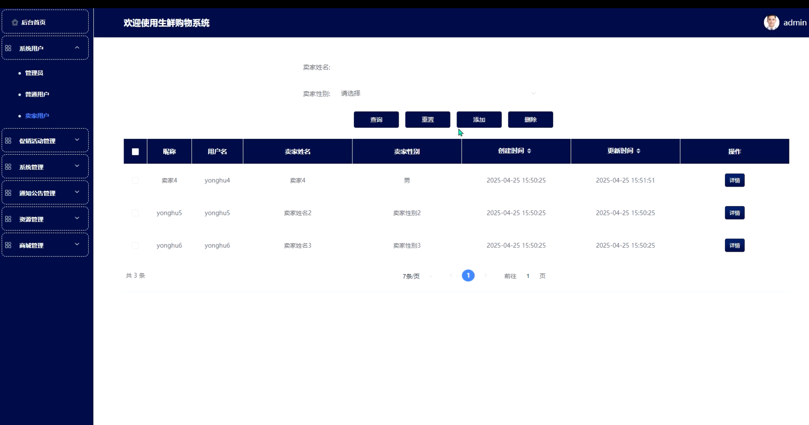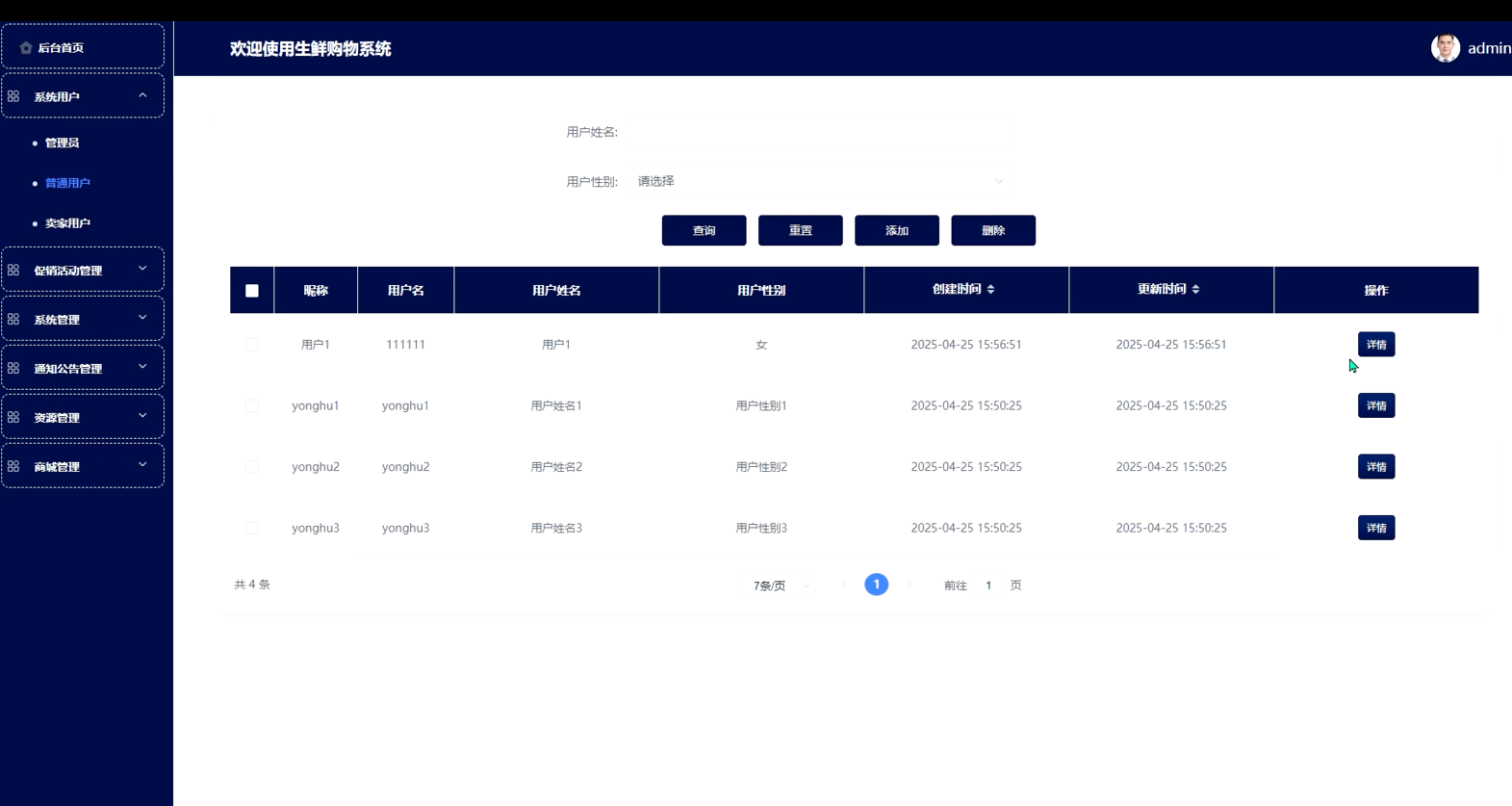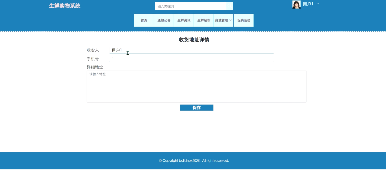With the rapid development of Internet technology and e-commerce, the fresh food shopping industry has gradually transformed from offline entity mode to online platform. Traditional fresh food sales rely on physical storefronts, which have problems such as high operating costs, limited sales scope, and untimely information updates. The fresh shopping system adopts front-end Vue and back-end SpringBoot technology architecture, combined with MySQL database. The system provides users with functions such as fresh food information, promotional activities, notification announcements, fresh supermarkets, fresh food details, address management, shopping carts, order management, and after-sales applications; Sellers can view promotional activity lists, order lists, and handle after-sales orders; Administrators are responsible for managing regular users, seller users, promotional activities, notifications, fresh food information releases, and mall system management.