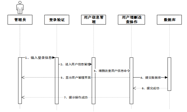 管理员输入登录信息后,进入用户信息管理模块,选择增删改查操作并提交命令至数据库。数据库执行操作后返回成功状态,系统显示用户管理界面并提示操作成功。管理员修改用户信息时序图如图4-5所示。