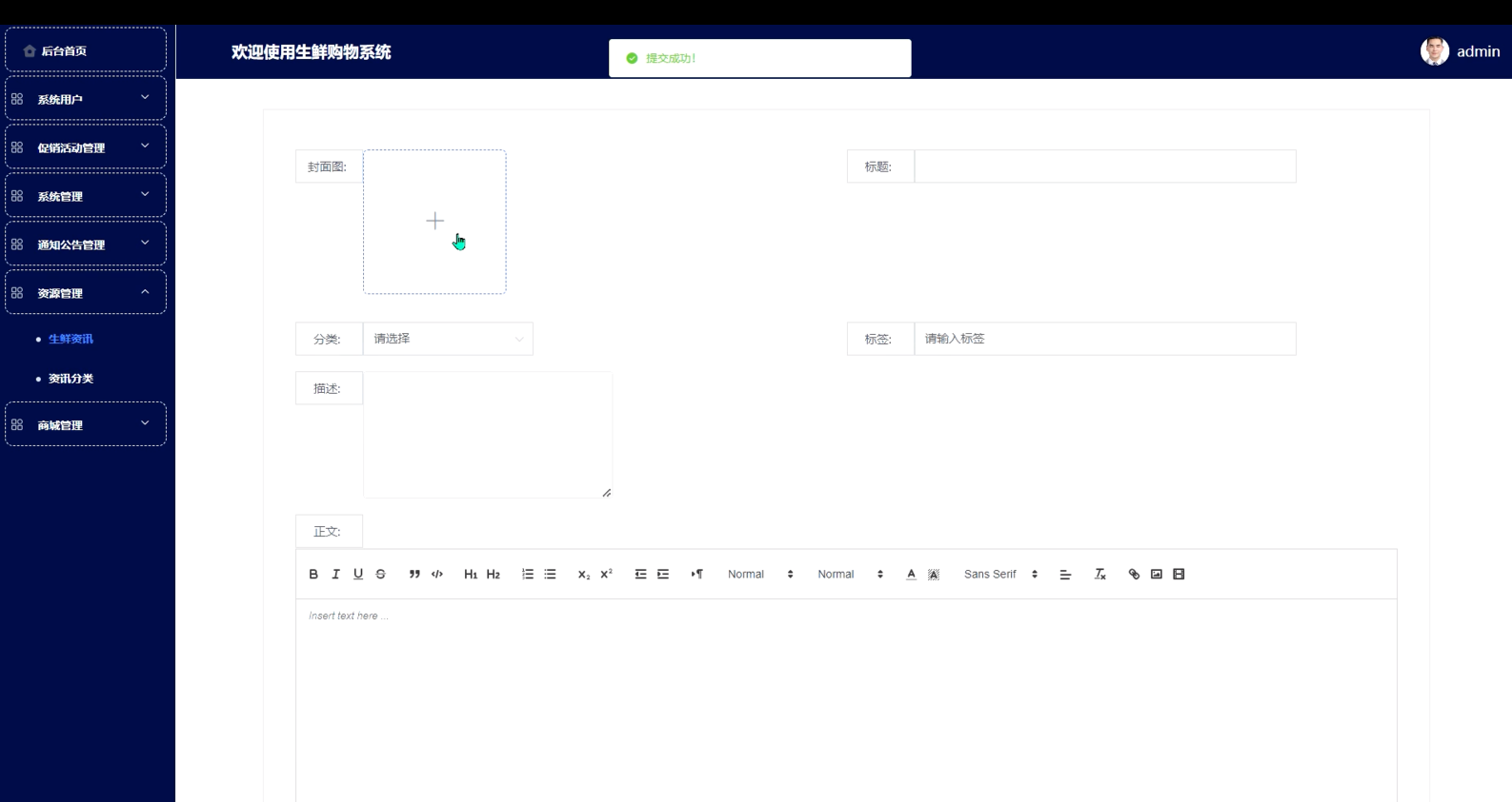 管理员可以添加生鲜资讯,填写资讯标题、内容、图片等信息。管理员可以查看已发布的资讯列表并进行编辑或删除操作。生鲜资讯添加界面如图5-21所示。