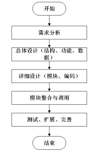系统开发流程的主要步骤,从需求分析到系统完成的全过程。流程包括需求分析、总体设计(结构、功能、数据)、详细设计(模块、编码)、模块整合与调用,以及测试、扩展和完善,最终完成系统的开发。本系统的开发流程如图3-3所示