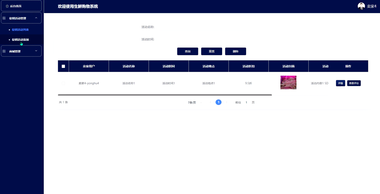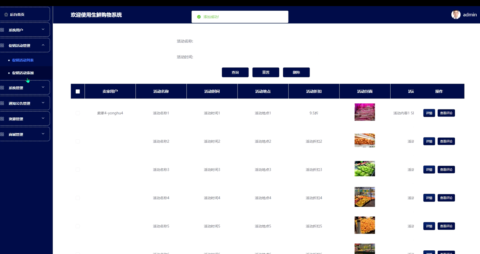 管理员可以查看所有促销活动的列表,包括活动名称、时间、状态等。管理员可以点击活动详情查看参与情况或编辑活动内容。促销活动列表界面如图5-18所示。