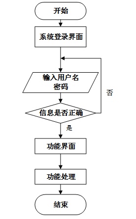 用户首先进入系统登录界面,输入用户名和密码后,系统验证信息是否正确。若验证失败,返回登录界面重新输入;若验证成功,则进入功能界面,执行相应功能处理后结束操作流程。操作流程如图3-5所示。