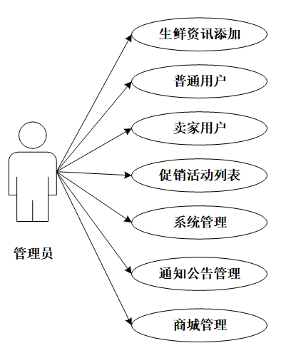 管理员功能包括管理普通用户、管理卖家用户、查看促销活动列表、进行系统管理、管理通知公告、添加生鲜资讯以及管理商城。管理员可管理普通用户,维护用户信息;管理卖家用户,规范店铺运营;查看促销活动列表,评估活动效果;进行系统管理,优化系统性能;管理通知公告,发布重要信息;添加生鲜资讯,丰富平台内容;管理商城,优化商品分类。管理员通过这些功能,确保平台稳定运行,提升用户体验,推动平台发展。