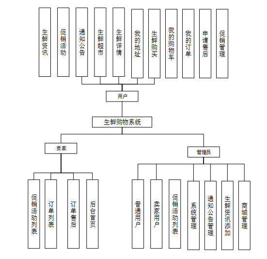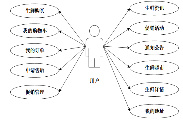 用户功能涵盖浏览生鲜资讯、查看促销活动、阅读通知公告、访问生鲜超市、查看生鲜详情、管理我的地址、进行生鲜购买、操作我的购物车、查看我的订单、申请售后以及参与促销管理。用户可浏览生鲜资讯,了解行业动态;查看促销活动,获取优惠信息;阅读通知公告,掌握平台动态。用户可在生鲜超市选购商品,查看生鲜详情,了解产品信息;管理我的地址,方便收货;进行生鲜购买,完成订单创建;操作我的购物车,管理选购商品;查看我的订单,跟踪订单状态;申请售后,处理售后问题;参与促销管理,享受优惠活动。