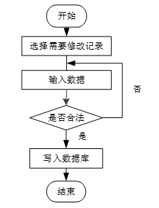 用户首先选择需要修改的记录,输入修改后的数据,系统判断输入数据是否合法。若数据不合法,提示重新输入;若数据合法,则将修改后的数据写入数据库,完成操作后流程结束。修改信息流程图如图3-7所示。