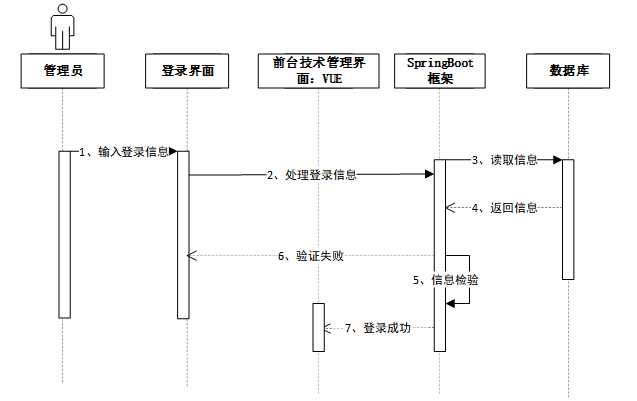管理员输入登录信息后,登录界面将信息传递至前台管理界面,随后通过SpringBoot框架读取数据库中的用户信息并返回。系统验证信息,若验证成功则登录成功,若验证失败则返回错误提示。登录时序图如图4-4所示。