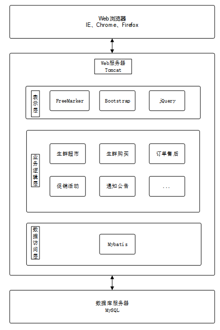 系统由表现层、业务逻辑层、数据访问层和数据库服务器组成。表现层通过浏览器(如IE、Chrome、Firefox)与用户交互,采用FreeMarker、Bootstrap、jQuery等技术实现界面呈现。业务逻辑层负责处理系统的核心业务逻辑,通过分模块设计实现功能分离。数据访问层使用MyBatis框架连接数据库,执行数据的增删改查操作。数据库服务器采用MySQL进行数据存储和管理,为系统提供稳定的数据库支持。整个架构通过Tomcat服务器完成用户请求的接收和处理,确保系统的高效运行[17]。整个系统架构如图4-1所示。