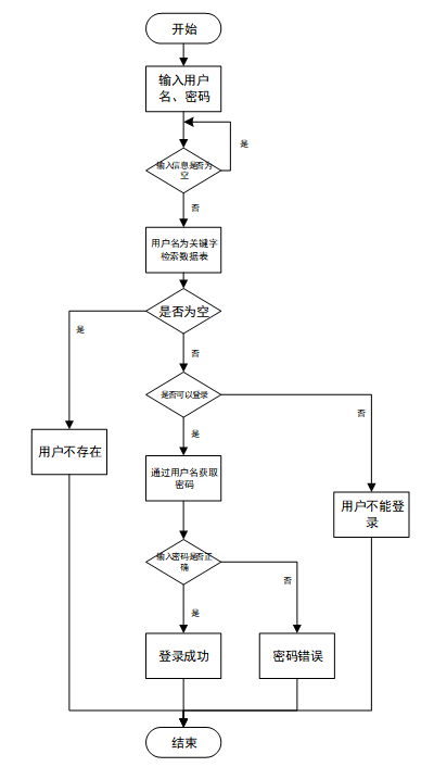 用户输入用户名和密码后,系统先检查输入是否为空,再验证用户名是否存在,若存在则通过用户名获取密码并校验。若密码正确则登录成功,否则提示密码错误。若用户名不存在或无法登录,提示用户操作无效。如图3-4所示。