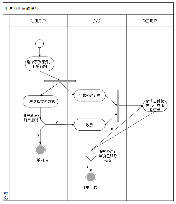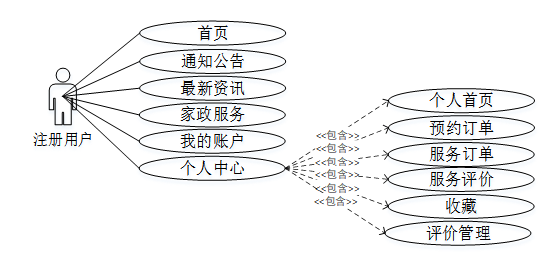 - 注册用户:可以在线浏览新闻和家政服务列表,搜索家政服务,下单预约支付服务,查看服务订单状态,评价和投诉交易等功能。