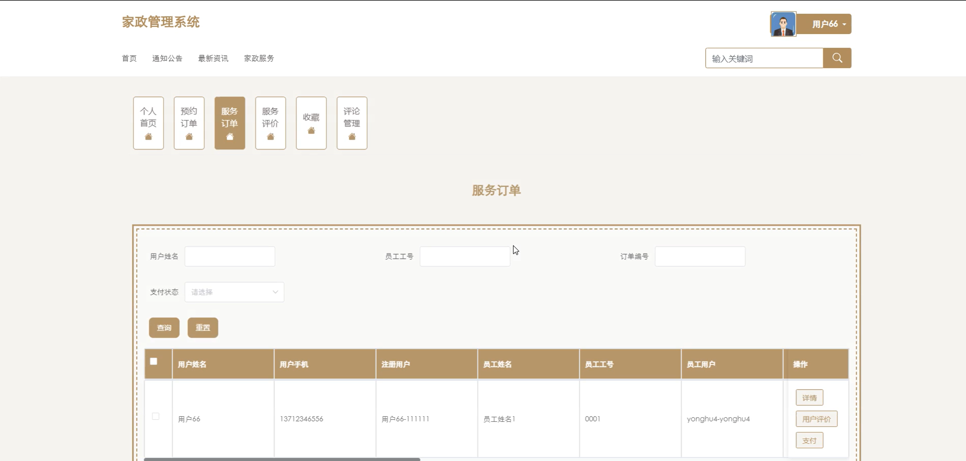 管理员可对所有服务订单进行管理和查看其信息详情,进行查询和删除操作,支持用户姓名、员工工号、订单编号、支付状态搜索,并可点击用户评价、支付操作。