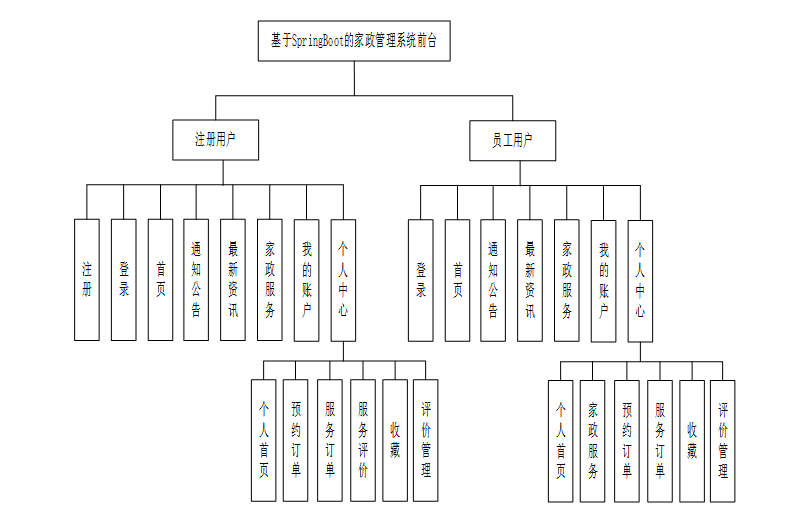 基于SpringBoot家政管理系统程序采用前后端分离的设计,前台功能主要分为注册用户和员工用户两大模块。游客可以浏览系统前台信息,注册成为注册用户,登录后才可进行其他操作。注册用户登录后,可搜索和浏览最新资讯、家政服务等信息,可以下单预约家政服务、并对预约订单进行支付、评价;员工用户用管理员添加生成的账号和密码进行登录系统,也可搜索和浏览最新资讯、家政服务等信息,并可以发布新的家政服务信息,处理下单预约信息,管理服务订单,也可进行评价订单操作。系统前台功能模块图如下图所示。