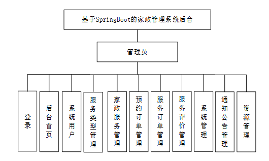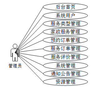 后台功能是管理员模块。其中管理员是系统最高权限拥有者,可管理用户、家政服务信息、订单、评价、资讯等信息,并保证及时更新系统信息,维护系统正常运行。系统后台功能模块图如下图所示。