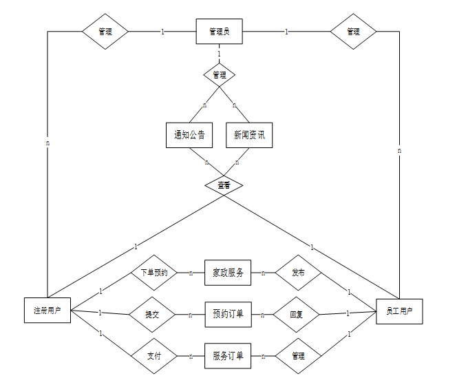 本文在系统分析阶段就抽取了一些实体,根据实体之间的关系,经过分析进行系统E-R图的设计。家政管理系统总体E-R图如下图所示。
