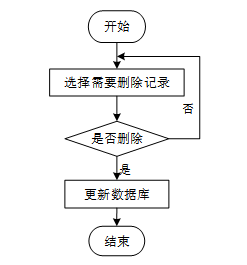 用户选择需要删除的记录后,系统判断是否确认删除。若未确认,返回选择环节;若确认删除,则更新数据库,删除对应记录,完成操作后流程结束。删除信息流程图如图4-5所示。