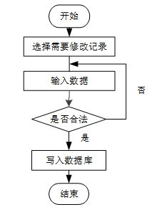 用户首先选择需要修改的记录,输入修改后的数据,系统判断输入数据是否合法。若数据不合法,提示重新输入;若数据合法,则将修改后的数据写入数据库,完成操作后流程结束。修改信息流程图如图4-4所示。