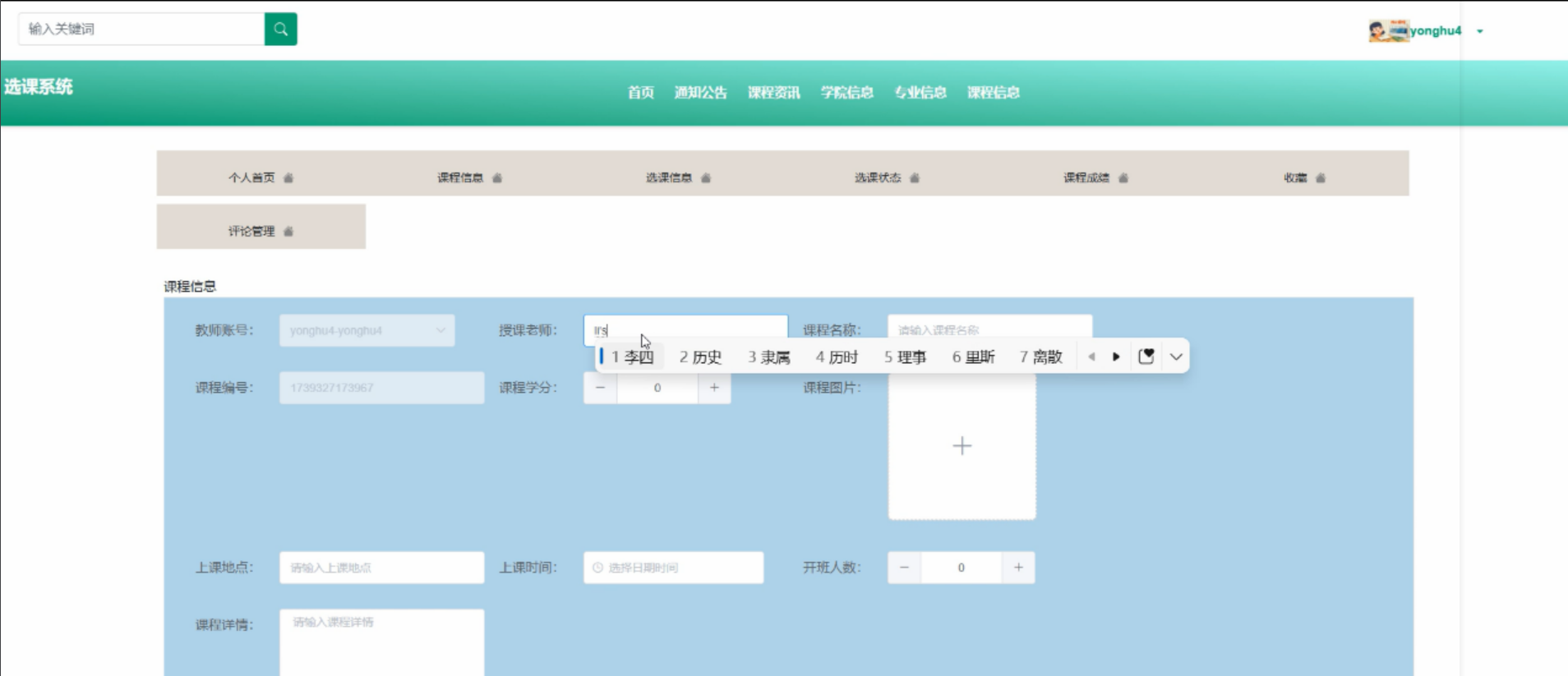 课程资讯模块提供课程的详细介绍,如课程大纲、教学安排、授课教师等,帮助学生做出选课决策。学生可以了解课程内容和要求,选择最适合自己的课程。教师也可以通过此模块更新课程的相关信息,保证课程的完整性和准确性,提升教学管理效率。课程资讯界面如图5-4所示。
