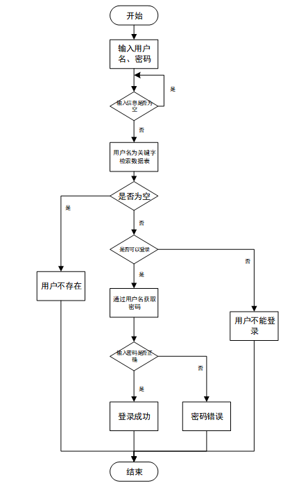 用户输入用户名和密码后,系统先检查输入是否为空,再验证用户名是否存在,若存在则通过用户名获取密码并校验。若密码正确则登录成功,否则提示密码错误。若用户名不存在或无法登录,提示用户操作无效。如图4-2所示。
