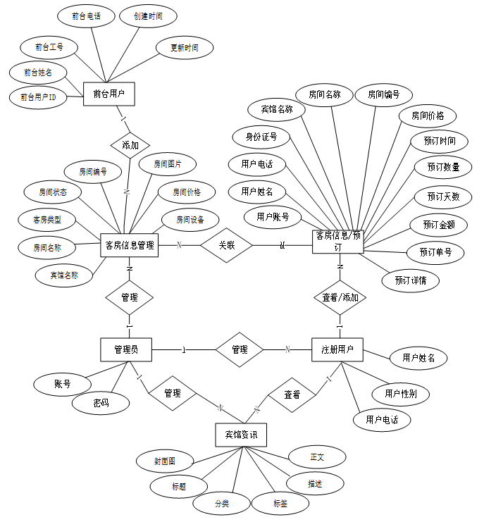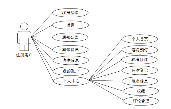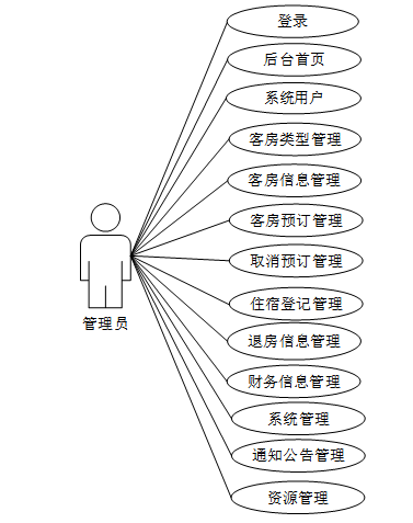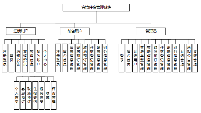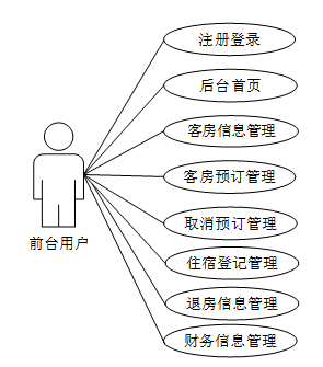 宾馆住宿管理系统包含注册用户、 前台用户、管理员三个角色划分,每个角色对应的主要功能如下: