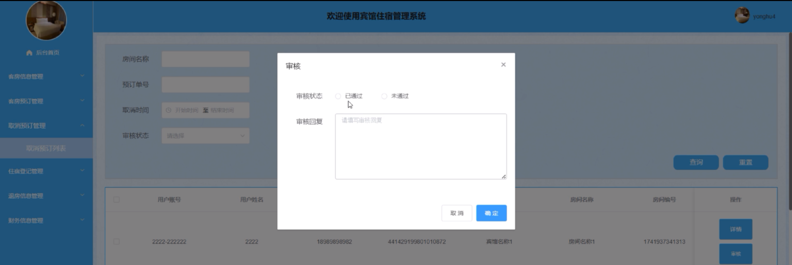 (5)取消预订管理:前台用户点击可查看取消预订列表,可对用户提交的取消信息进行审核回复。