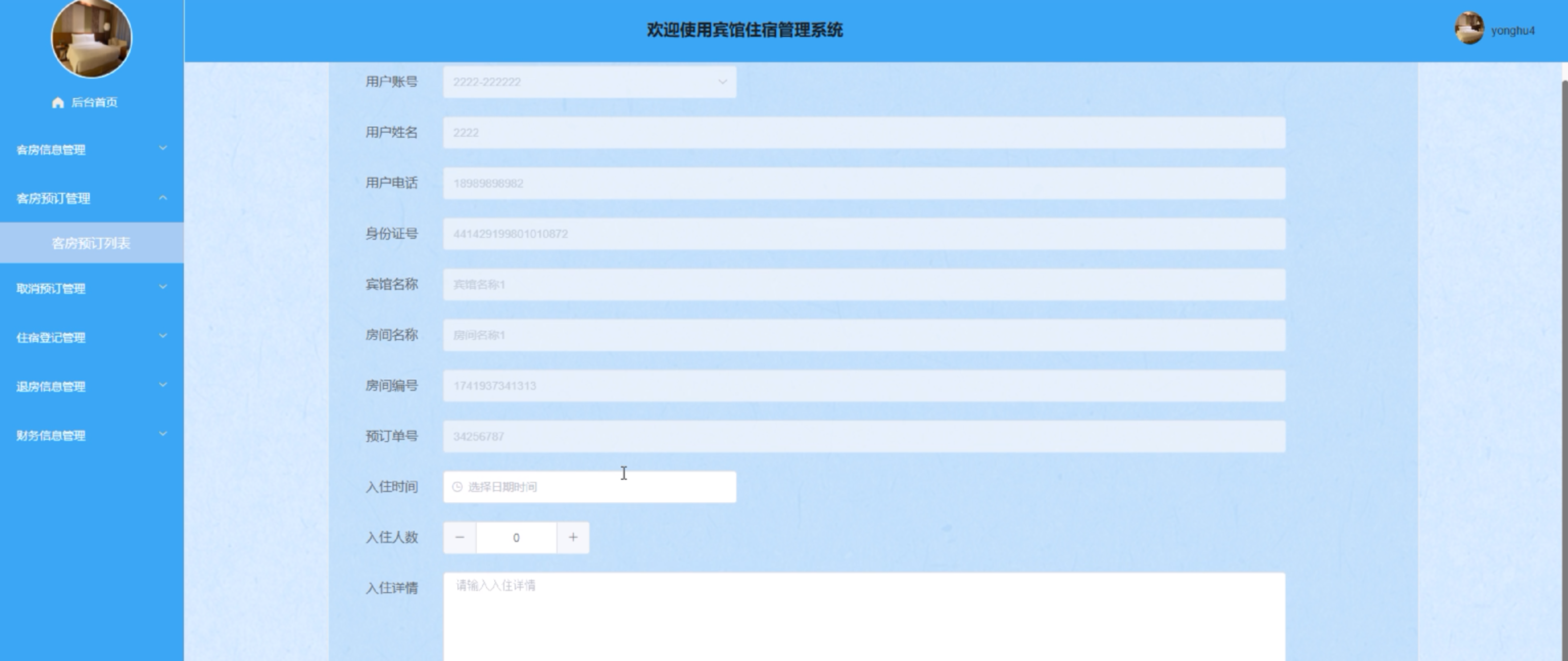 (4)客房预订管理:前台用户点击可查看客房预订列表,可点击“入住”按钮添加入住信息,包括入住时间、入住人数和入住详情。