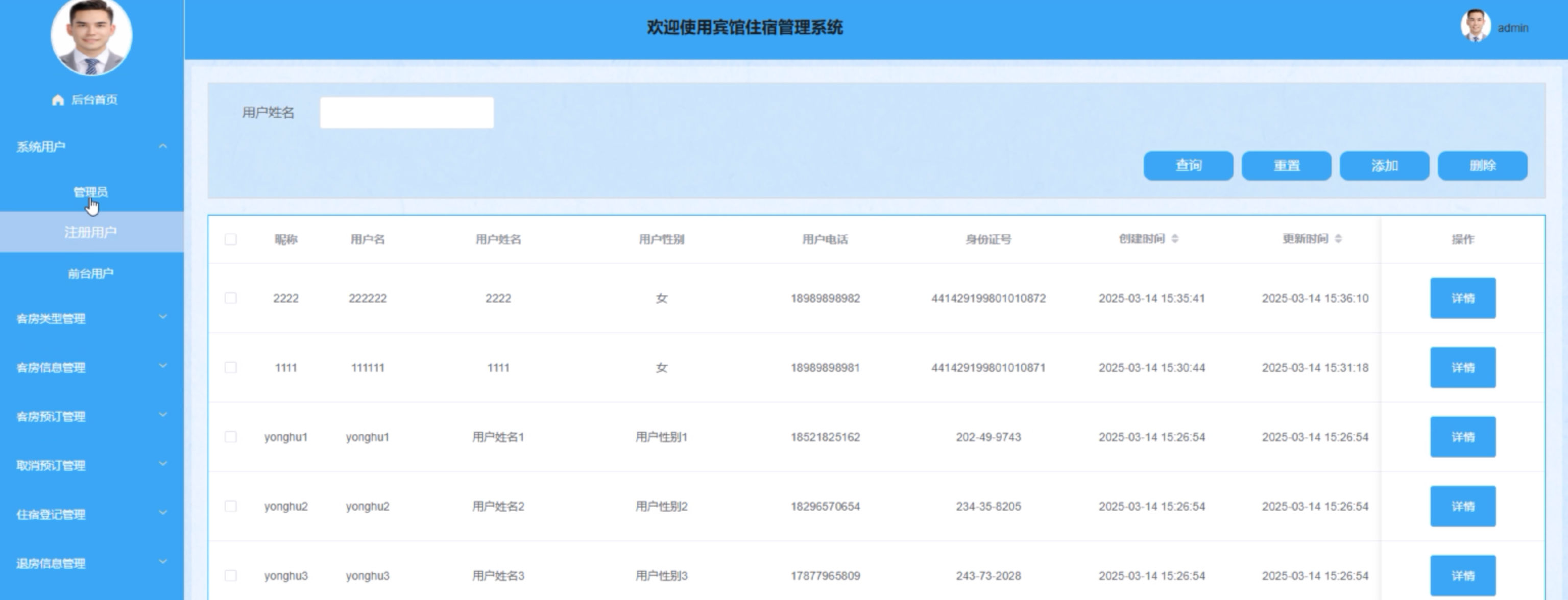 (3)系统用户:管理员可以查看系统用户(管理员、注册用户、前台用户)列表中某个用户的详情,可以对用户信息进行查询、审核、添加和删除操作。