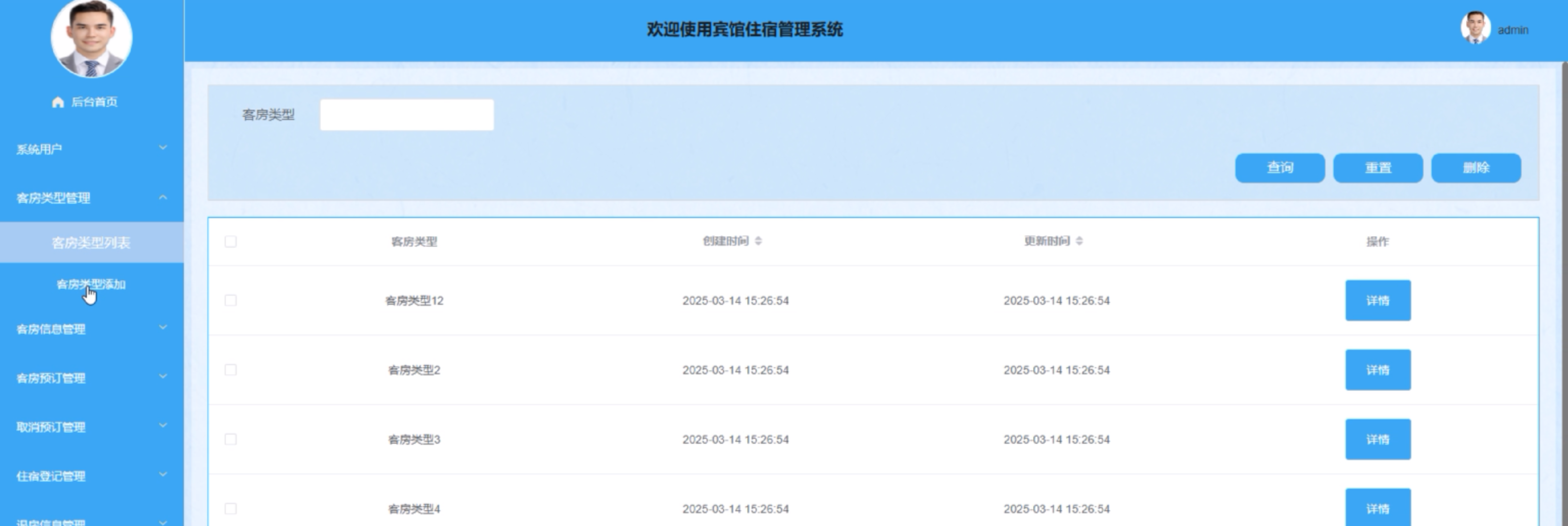 (4)客房类型管理:管理员点击可查看客房类型列表,同时可客房类型进行增删改查。