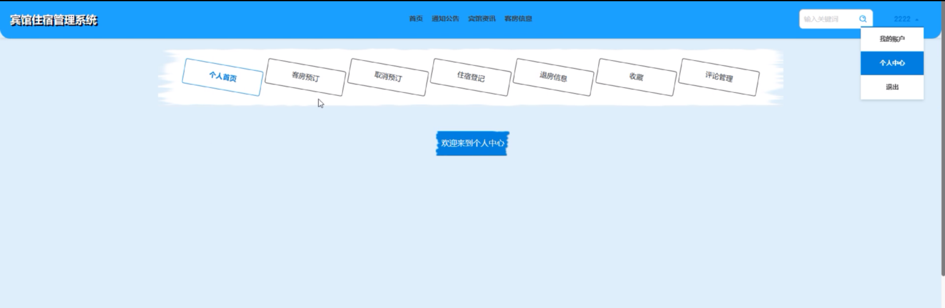 (7)个人中心:个人中心包含多个功能模块,如个人首页、客房预订、取消预订、住宿登记、退房信息、收藏和评论管理。点击进入“客房预订”可查看预订信息,在此页面还可进行取消或支付操作。